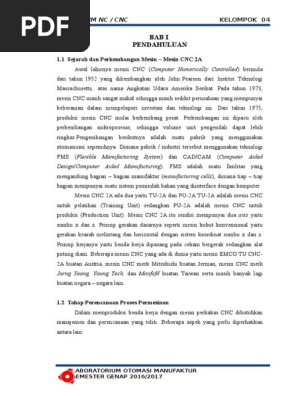Computer numerical control disingkat cnc berarti komputer kontrol numerik merupakan sistem otomasi mesin perkakas yang dioperasikan oleh perintah yang diprogram secara abstrak dan disimpan di media penyimpanan hal ini berlawanan dengan kebiasaan pada masa sebelumnya di mana mesin perkakas atau mesin bubut biasanya dikontrol atau dikendalikan dengan putaran tangan atau otomasi sederhana. Tip from the pros. Sejarah teknologi mesin cnc awal lahirnya mesin cnc computer numerically controlled bermula dari 1952 yang dikembangkan oleh john pearseon dari institut teknologi massachusetts atas nama angkatan udara amerika serikat. Sumbu berbeda menggambarkan cara bagaimana benda kerja atau alat potong dapat diposisikan dipergunakan dan dirotasikan selama proses pemesinan.